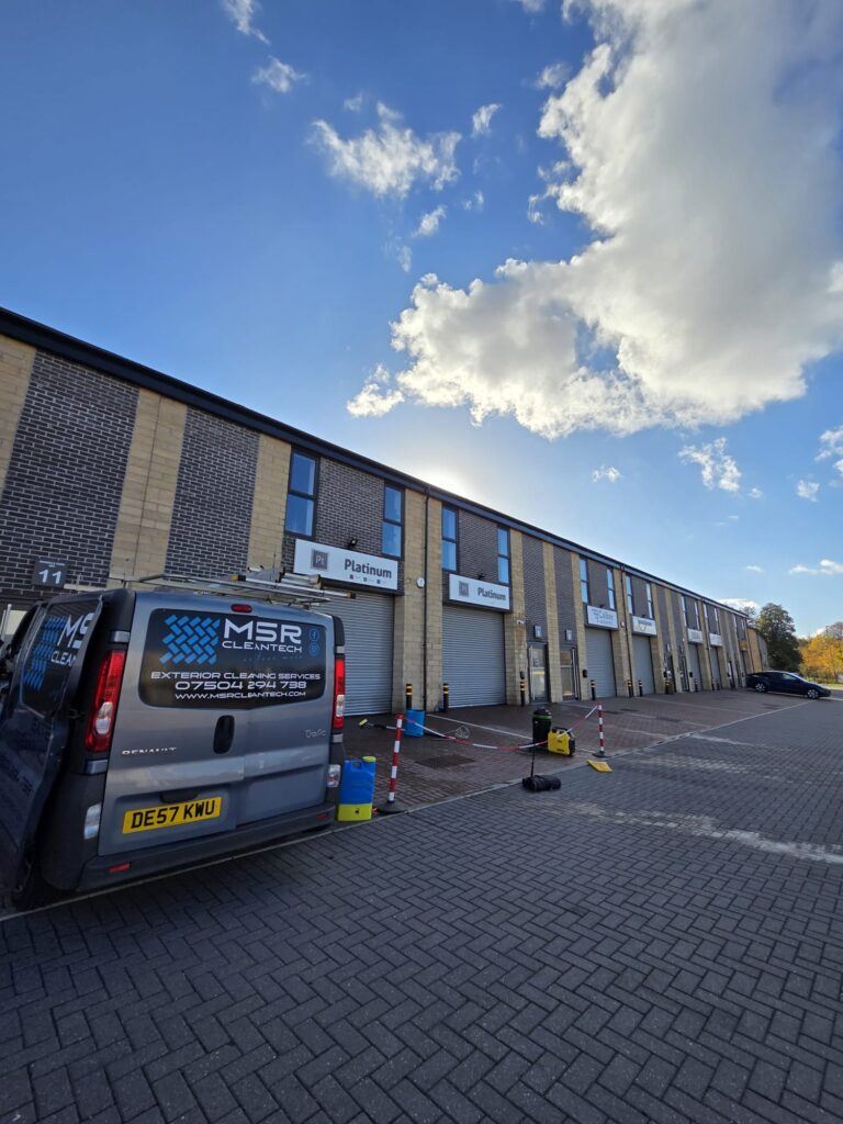 - Pressure Washing – High-powered cleaning for hard surfaces such as concrete, tarmac, and paving. Removes dirt, oil stains, algae, and general build-up from car parks, loading bays, and pathways. Ideal for keeping external areas clean, safe, and professional-looking.